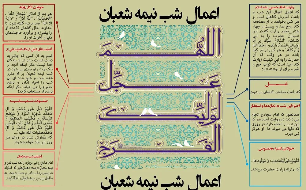 - دعای کمیل: این دعا در شب نیمه شعبان خوانده میشود و از دعاهای خاص این شب است.